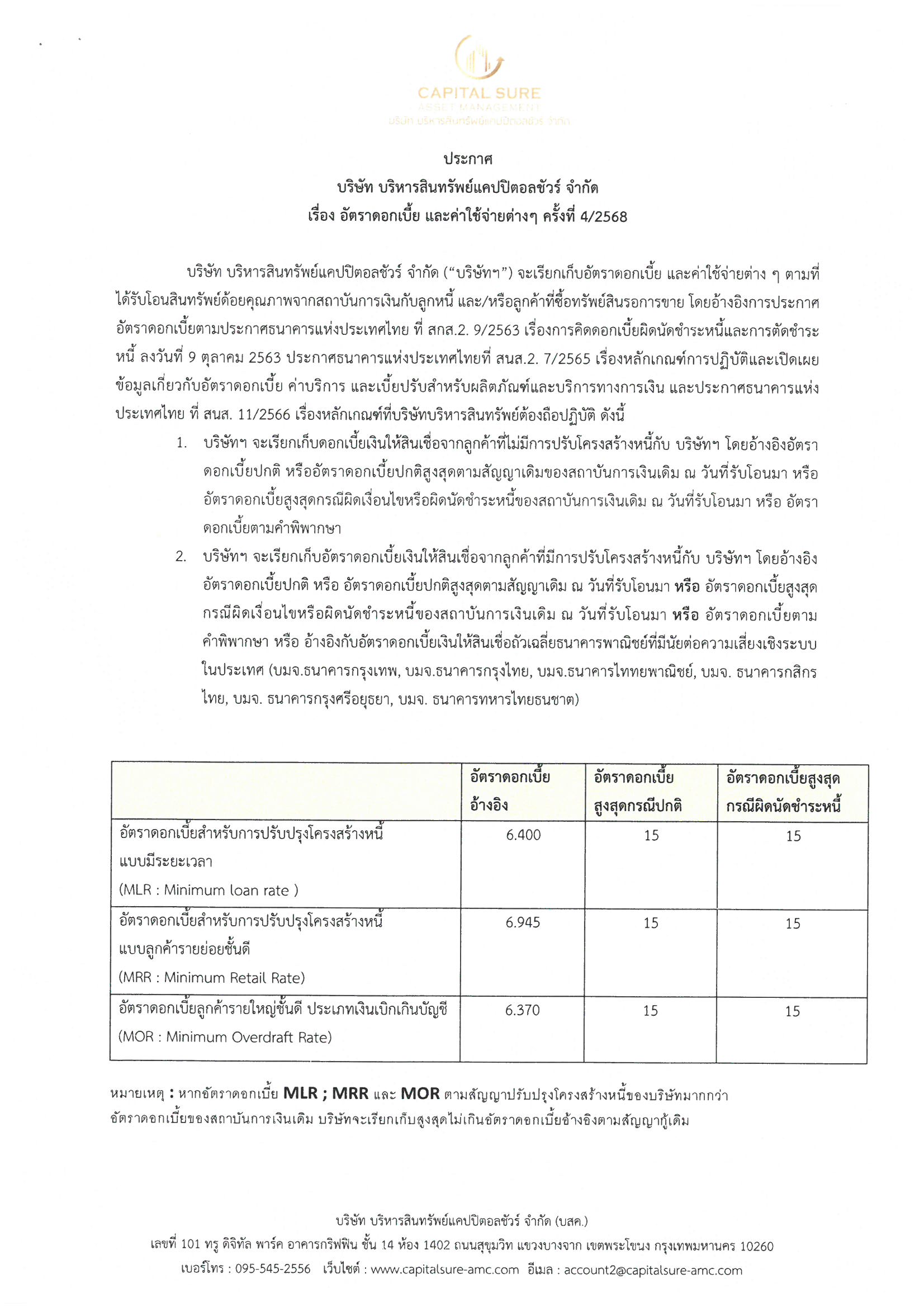 อัตราดอกเบี้ยสำหรับการปรับปรุงโครงสร้างหนี้ ครั้งที่ 4/2568